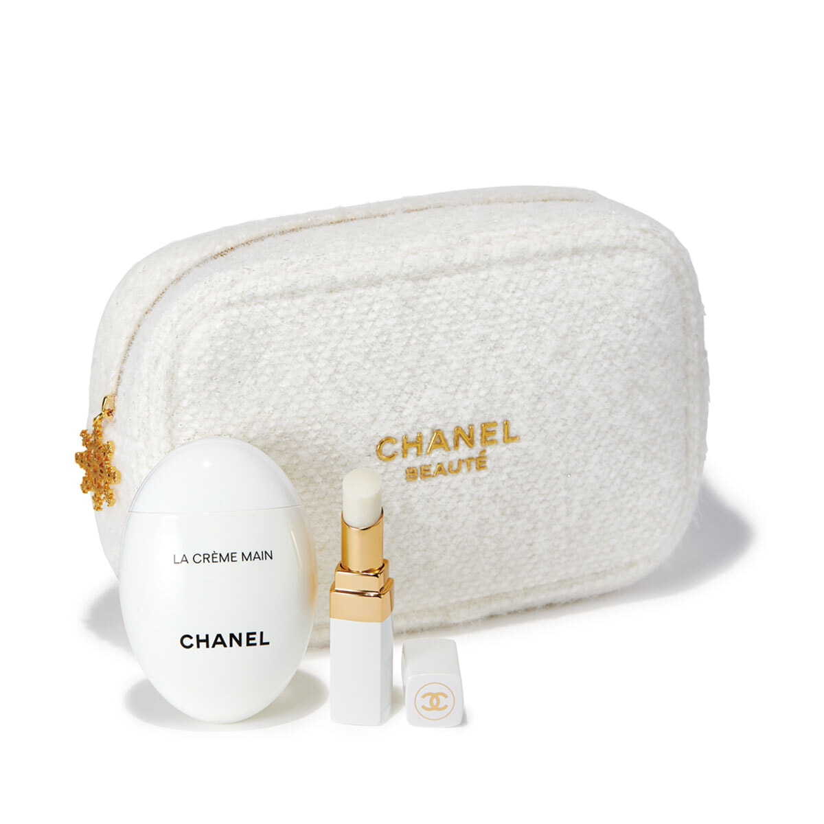 チャームが付いた白のツイード生地のポーチに、人気のハンドクリームとリップクリームをセット。自分のために、ギフトにも!