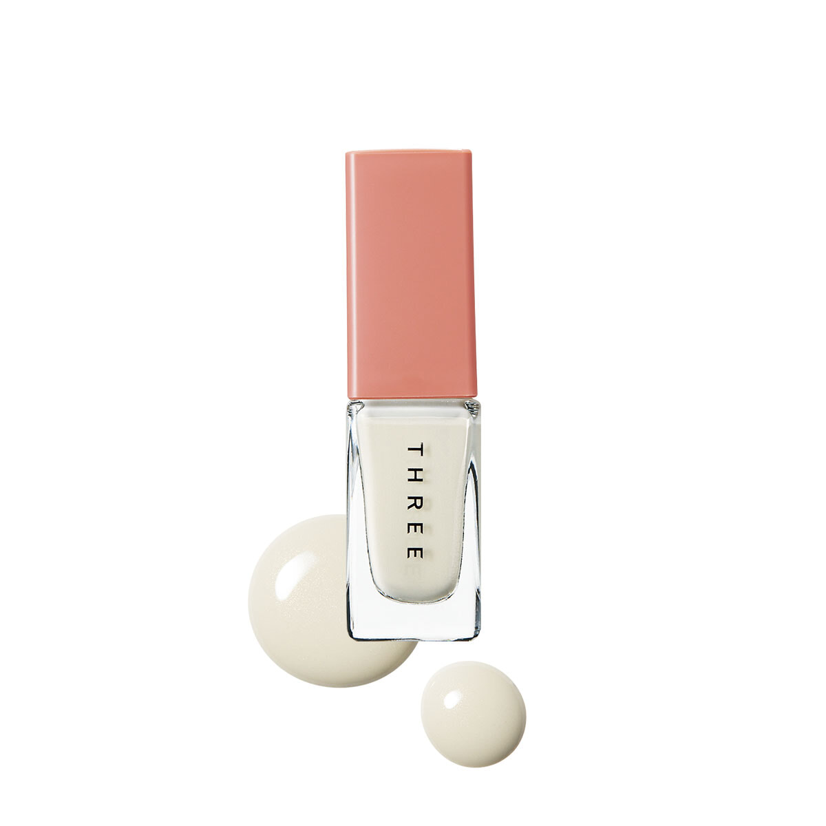 ほんのりゴールドと白のパールが潜むミルキーホワイトのネイルは、まろやかな光で指先をしなやかに見せる。ベースコート不要で速乾、ロングラスティ