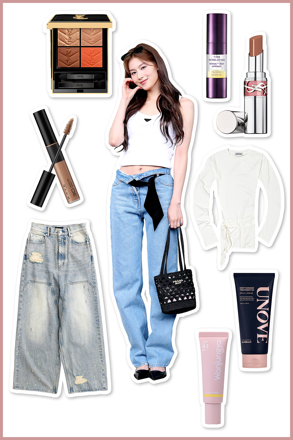 ツンととがったあご&つや玉が光るころんとした頬という球体型の輪郭に、大きな瞳と美フォルムな鼻が配置された”ヘムチ顔(可愛いハムスター顔を韓国ではそう呼ぶ)”。メイクはどんなファッションであろうとコンサバが基本。肌はファンデーション前にパール感のある下地を仕込み、光を内包するような質感に仕上げることで、球体顔をより可愛く強調。カラーメイクは、コーラル系のアイシャドウに肌映えするベージュリップという組み合わせが定番だが、隠れたポイントは眉。アイ&リップメイクとリンクするような暖色系のアイブロウマスカラを使って薄めの柔らか眉に仕上げ、抜け感を演出している。スキンケアはレチノール美容液で、毛穴悩みやハリ不足に対応。風になびくふわっとツイストさせた髪もこまめなトリートメントケアでツヤ感をキープ!