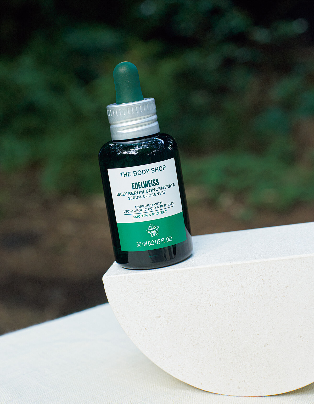 高山の厳しい環境で育つエーデルワイスのパワーに、コメペプチドやモリンガシードオイルを加え、肌の弾力と保湿による明るさをサポート。ブランド人気No.1美容液。●30ml¥6,270/ザボディショップ