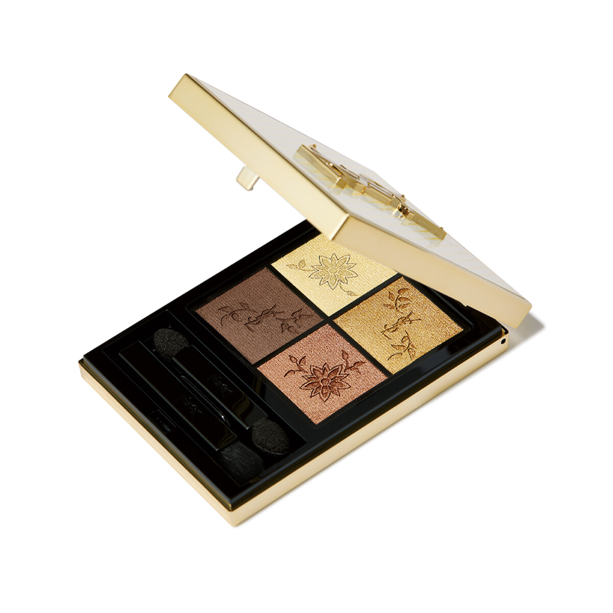 レースの透け感と、ラインストーンやスパンコールの煌めきをパレットに。下段左のマットブラウンが深みと奥行きをプラス。白いコンパクトと花のエンボス加工も特別。