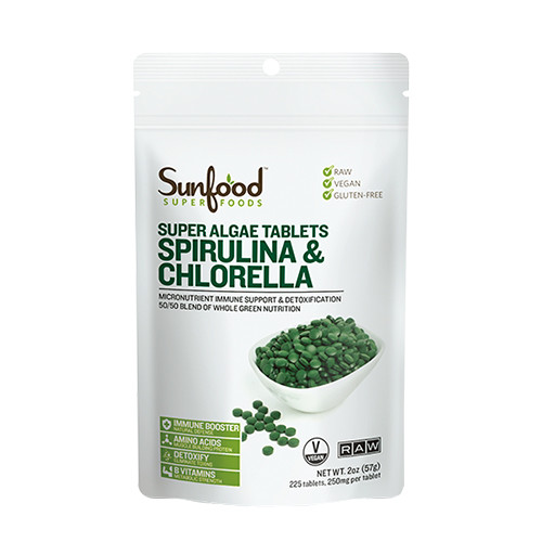 ふたつの藻類、スピルリナとクロレラを吸収率も考慮して飲みやすい錠剤に。クロロフィルやタンパク質が豊富で、鉄やビタミンB12、必須アミノ酸を含有。サンフード スピルリナ&クロレラ タブレット 225粒 ¥3,456/アリエルトレーディング