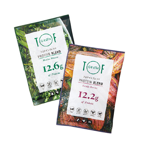 ヴィーガン対応のプロテインパウダー。動物性とは栄養素が異なるものの、エンドウマメ由来の植物性タンパク質が手軽に摂取できる。葉酸やポリフェノールも含有。左から、プロテイン ブレンド 抹茶オールスターズ、同 クリオロベリーズ 各20g 各¥399/ともにグリーンベース