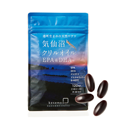 三陸沖のオキアミから抽出されたオイルには、EPA・DHAにアスタキサンチンなども含有。臭いが気にならないソフトカプセル。気仙沼クリルオイル 120粒 ¥5,940/ケセモ マリナス