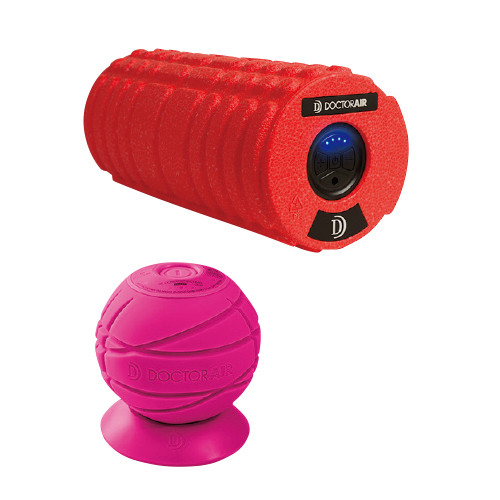 上奥:4段階振動で強力リリース。軽くて扱いやすい。ドクターエア ストレッチロール S ¥19,352 上:手のひらサイズの振動ボール。肩や関節などの部位に。同 3Dコンディショニングボール スマート ¥9,800/ともにドリームファクトリー
