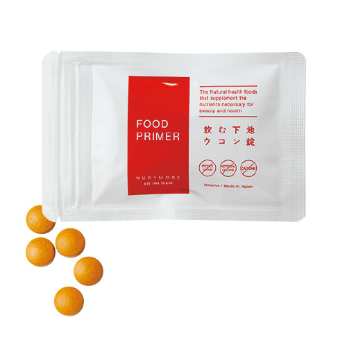 肝臓の働きを高めるウコンを丸ごと粉砕。代謝と解毒がスムーズな身体に。飲酒の前にも。ヌーディモア フードプライマー 75粒×2包 ¥5,184/クチュール