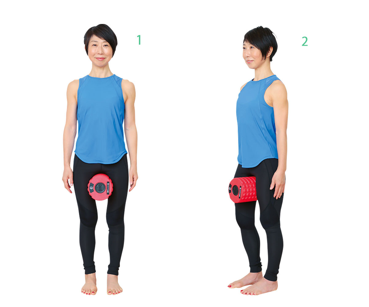 1. 足を平行にして立ち、ストレッチロールを恥骨にぴったり挟む。膝は正面に向け、左右を近づける。