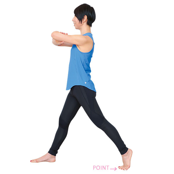 1. 肩の高さで腕を地面と平行に組み、脚を前後に開いて立つ。後ろ脚は母指球から足裏が曲がるようにして上に伸びてストレッチ。