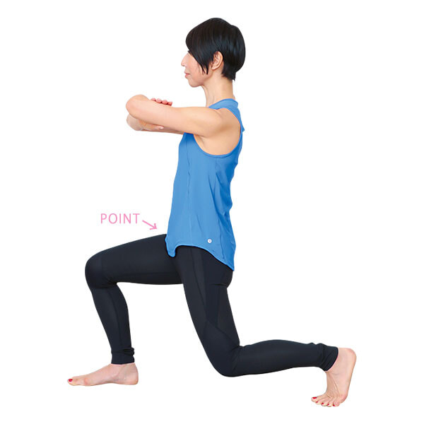 2. 前脚は股関節から曲げ、後ろ脚の前腿が伸びるように真下に下がってスクワット。腕が下がらないよう肘の高さをキープ、膝は床につけない。3秒したら上に伸びて1の体勢に戻す。5セット。