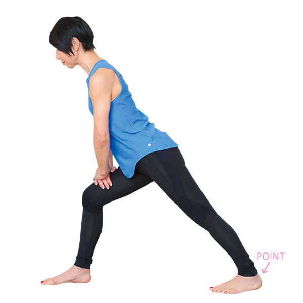3. 1の姿勢から前膝を曲げて両手を添え、後ろ脚の踵をつけてふくらはぎを伸ばす。足首がやわらかくなり可動域が広がる。脚を入れ替えて1〜3を行う。