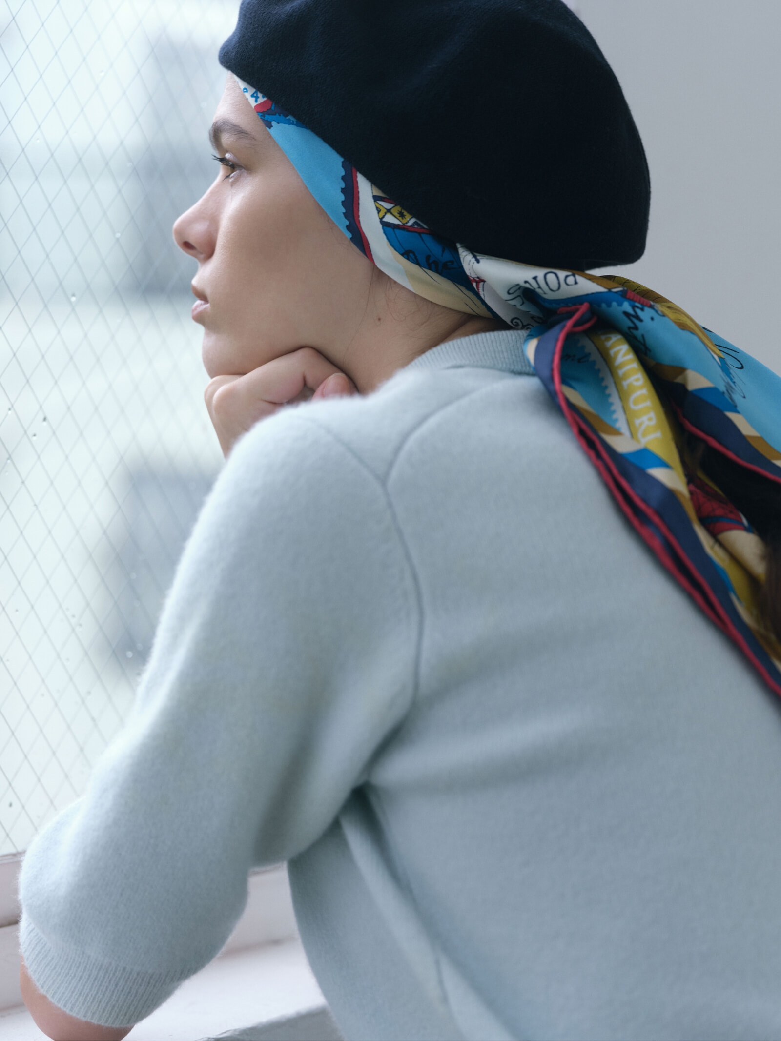 スカーフととベレー帽はヘアアクセサリーとしてだけではなく、凍てつく寒さから身を守る防寒対策としても重宝。人生を上手に生きる知恵を持つパリジェンヌのおしゃれのヒントを参考に、トータルバランスを緻密に計算。横顔も絵になるアンニュイなまつ毛をポイントに、冬をもっと楽しんで。