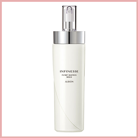 各層に染み込み、ハリ肌へ導く土台乳液。「押し返す弾力を注入。シワっぽさが消え、頰に丸みが出る。肌の光反射率が上がり、明るく見える副産物も」。アンフィネス パンプ マトリクス ミルク 200g ¥7,700/アルビオン