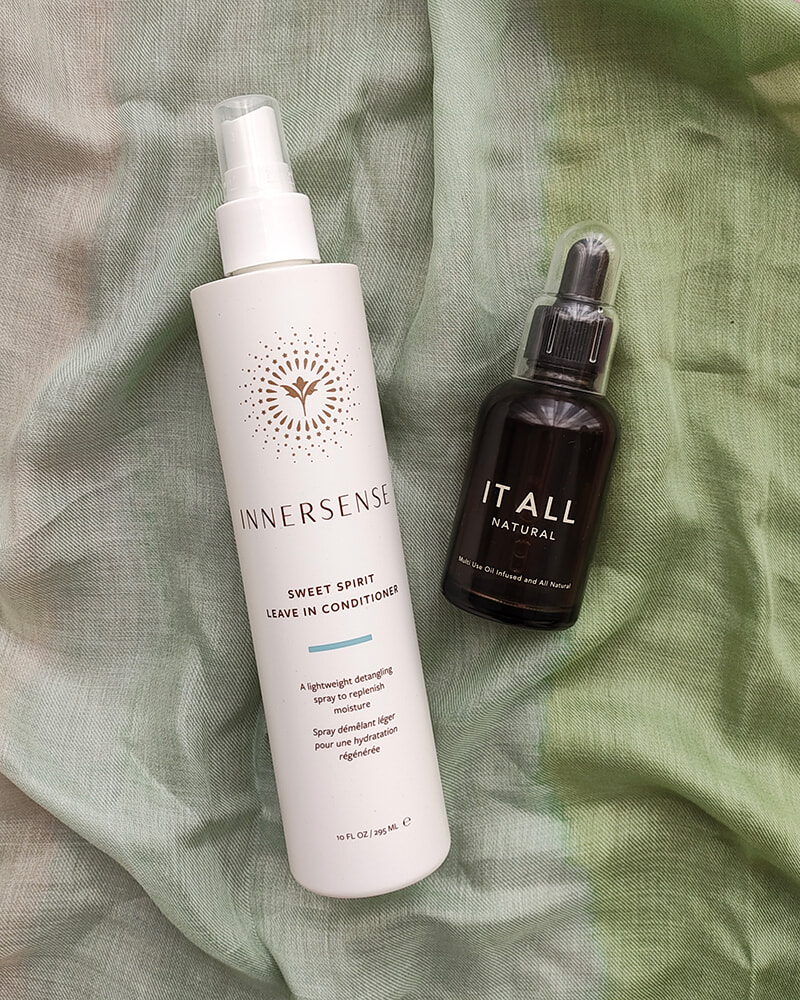インナーセンスのトリートメントは、スプレーなのにちょっとクリーミーな使用感で、保湿もしっかり。アロエベラのエキスやタマヌオイル、ローズマリーオイルなど髪や頭皮のための成分がたっぷり配合されています。イットオールナチュラルのオイルは、昨年のリニューアルでこの重めテクスチャーのものが仲間入りしたのですが、これぞ!というこっくり感。植物由来の毛髪補修成分が含まれるうえ、香りがとーっても良くて、眠る前の癒やしです。どちらもプロのスタイリスト目線で作られたもので、納得の使い心地。