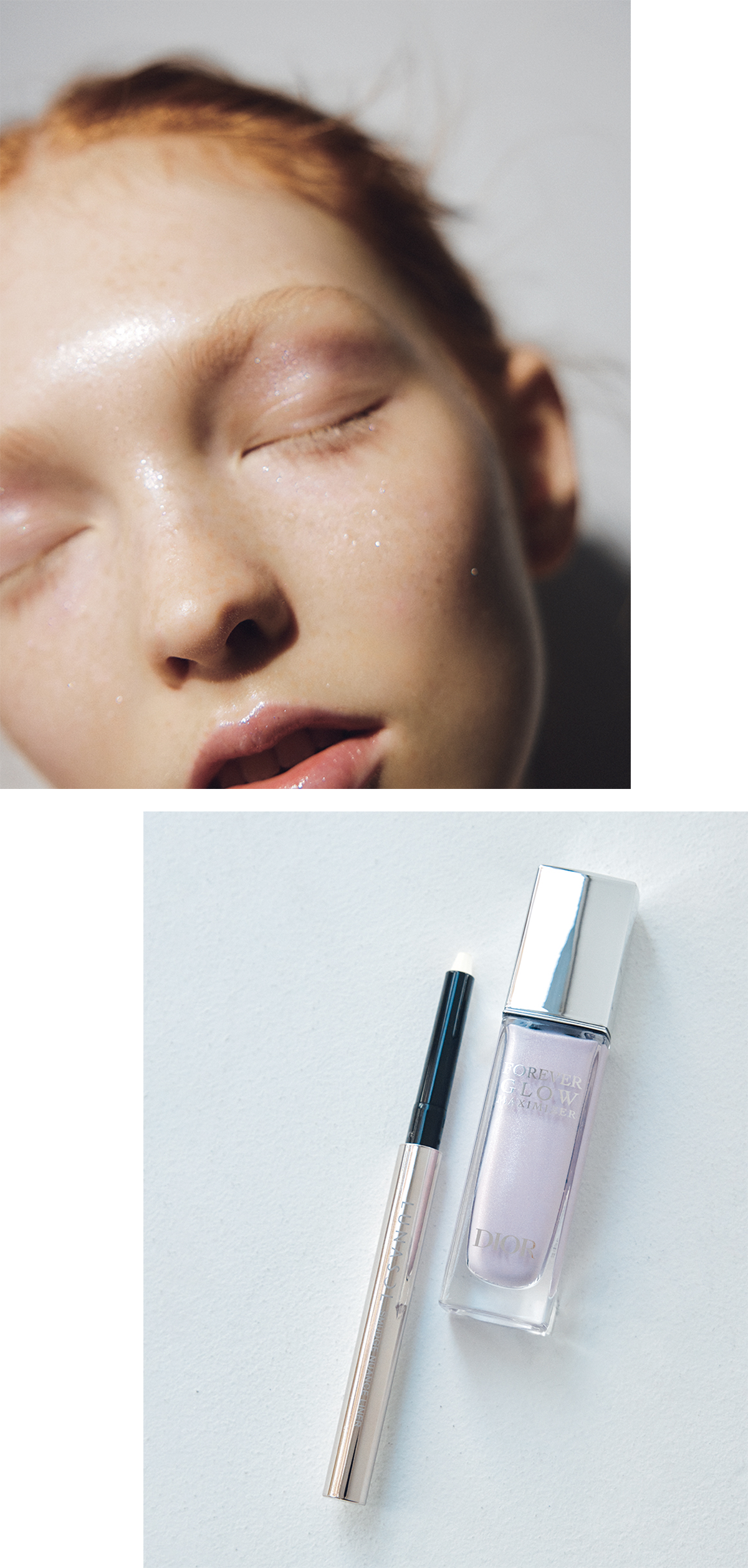 煌めくグリッターの質感を引き立てたいので、肌は作り込みすぎないほうがいい。メイク下地で肌をみずみずしく整えたら、気になるところのみコンシーラーを使ってピンポイントでカバーする程度に。