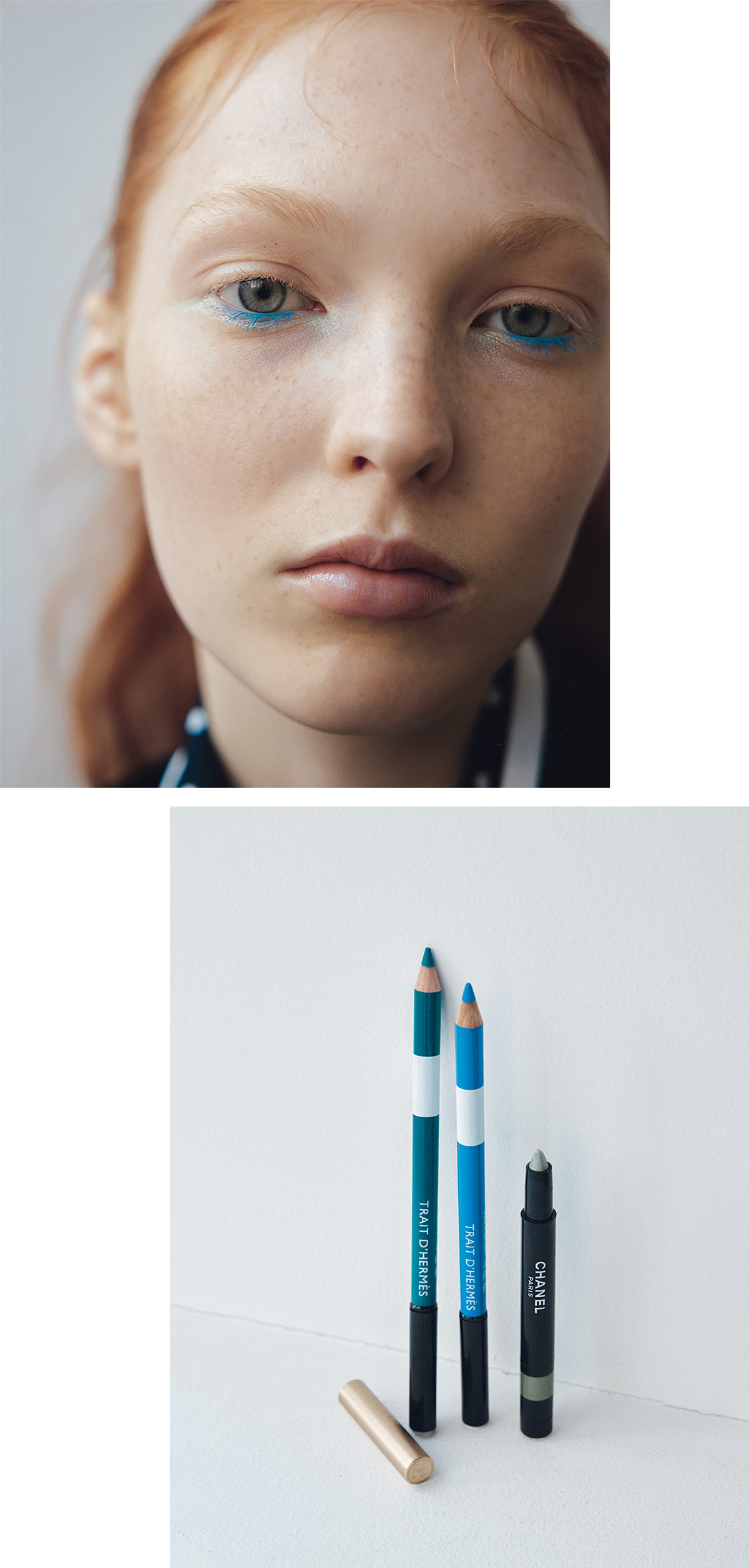 実は誰でも簡単に真似しやすい下まぶたメイク。インパクトあるブルーグリーンのアイライナーを肌浮きさせないコツは、同系色のアイシーカラーをあらかじめ仕込んでおくこと。