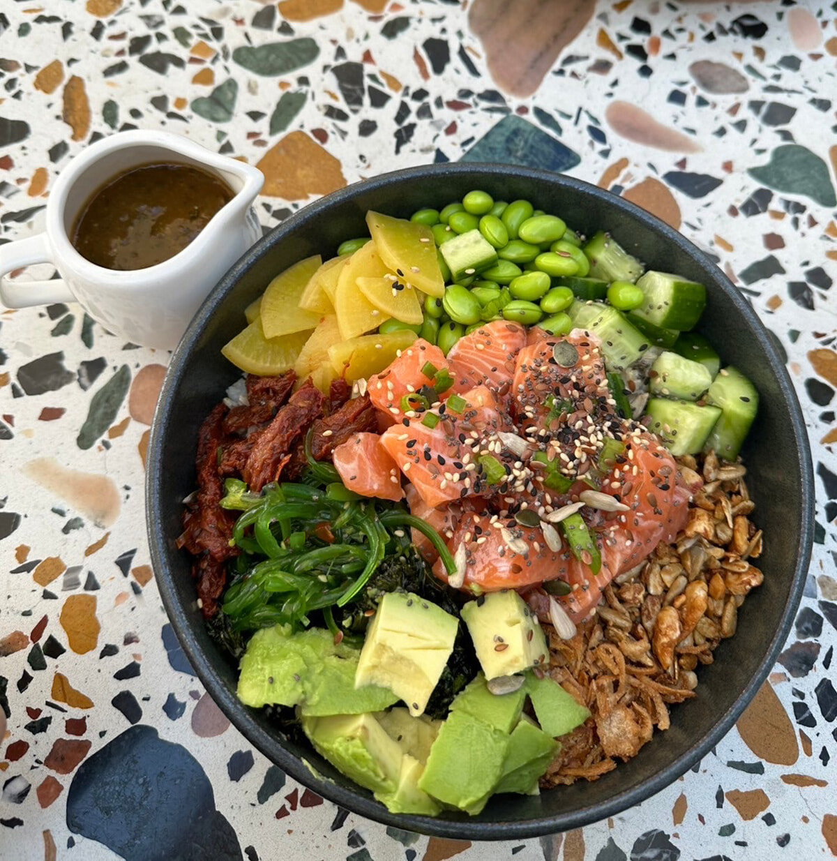 「こちらはエミレーツ時代に住んでいたドバイでお気に入りの一軒。ビーチ沿いにある、オールデイブレックファーストが人気のお店で、ヘルシーなメニューがいただけます。写真の『ポケボウル』は、サーモンもアボカドも新鮮! ビーチ沿いをウォーキングした後にぴったりの一皿でした」