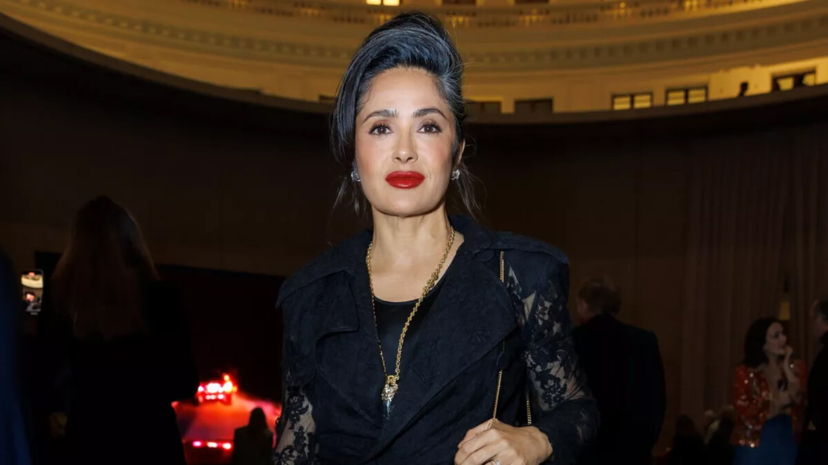 この日、サルマ・ハエックは真っ赤な唇をワンポイントに、全身黒でまとめたスタイルだった。髪はボリューミーにまとめ、白髪まじりの髪が額に無造作にかかっている。