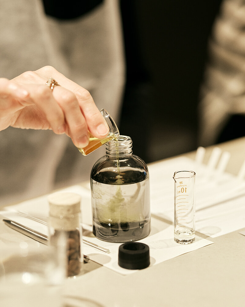 精油への理解を深めた後は、ディフューザークラフト体験。ベースノートとカスタムノートをかけ合わせ、ひとりひとり好みの香りを作り上げていく。