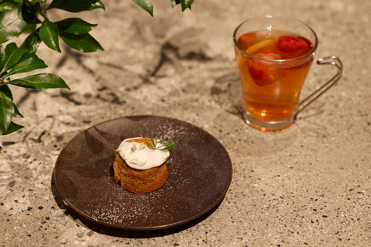 ディフューザー作りに集中した後は、ティータイム。隣接するリバイブ キッチン スリー ヒビヤの特製キャロットケーキと、南阿蘇でとれたカモミールジャーマンやゼラニウムのハーブティーでひと息。