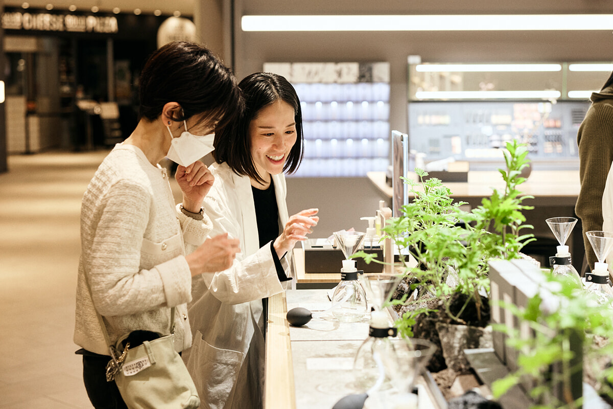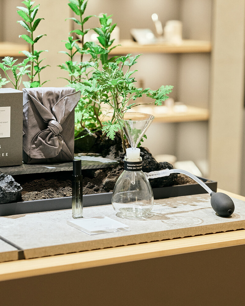 ショップ内では3月20日に発売となったブランド誕生15周年を記念した特別なフレグランス、スリー エッセンシャルセンツの限定3種の香りが、南阿蘇の畑からやってきた植物や土とともにディスプレイされていた。この香水は国産精油のみで調香され、それぞれ「薄明」「残夜」「宵」という時のグラデーションを表している。