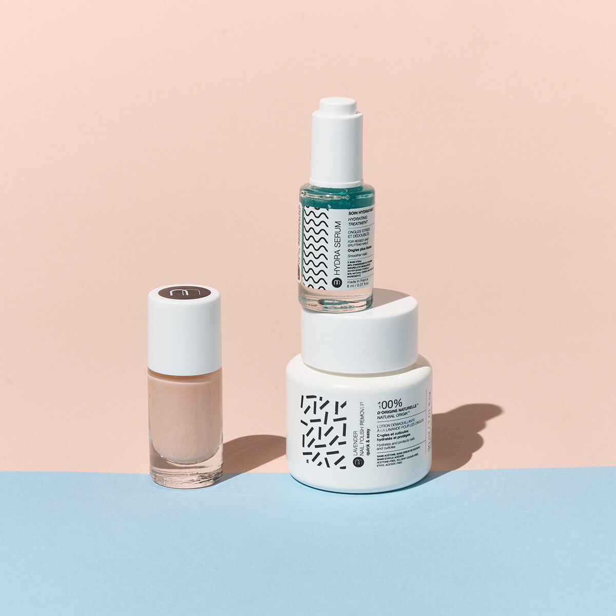 左:”爪用ファンデーション”。NMビービーネイル ミディアム ¥2,310 右上:爪用美容液。MNハイドラセラム 8ml ¥2,640 右下:爪先を入れて軽くこするだけで簡単ネイルオフ。NM ネイルポリッシュリムーバー(ディップインタイプ) 30ml ¥2,420/以上ネイルマティック