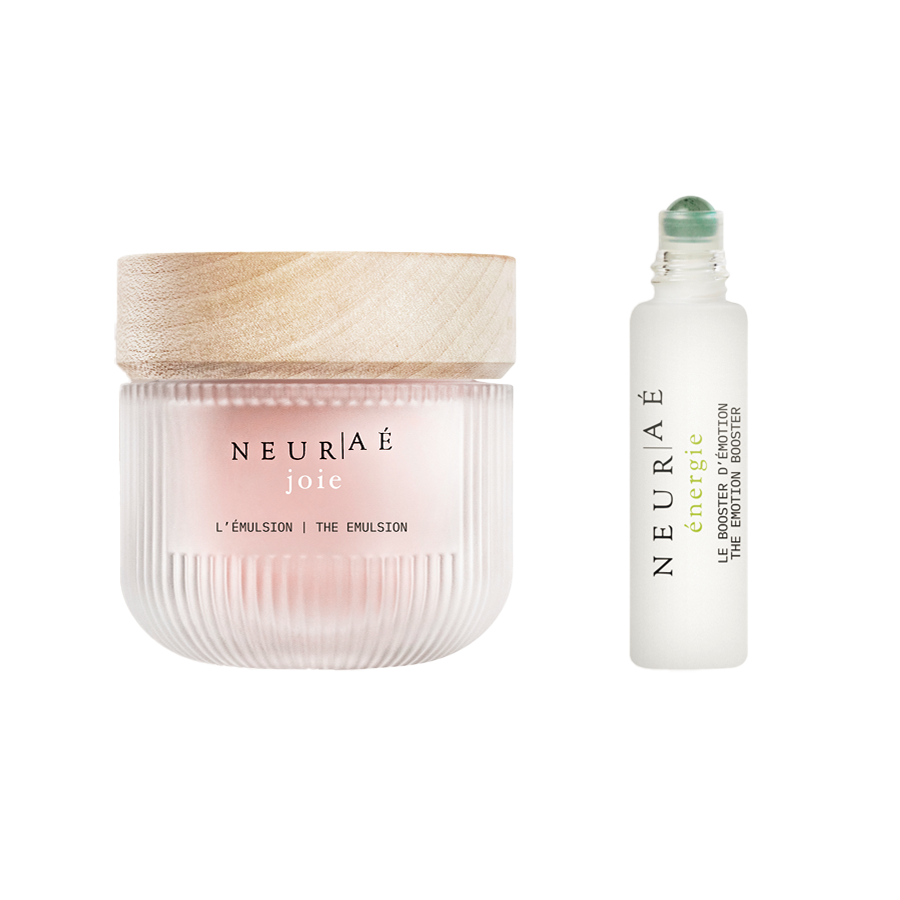シスレーグループの神経科学に基づく新ブランド。感情と肌状態の関係に着目し、成分、香り、テクスチャーを開発。美容液と3 種のクリーム、ロールオンフレグランスを組み合わせる。左から、joie L’Émulsion Euphorisante&Éclat 50ml 130ユーロ、énergie Le Booster d’Émotion 6.5ml 50ユーロ https://www.neurae.com/