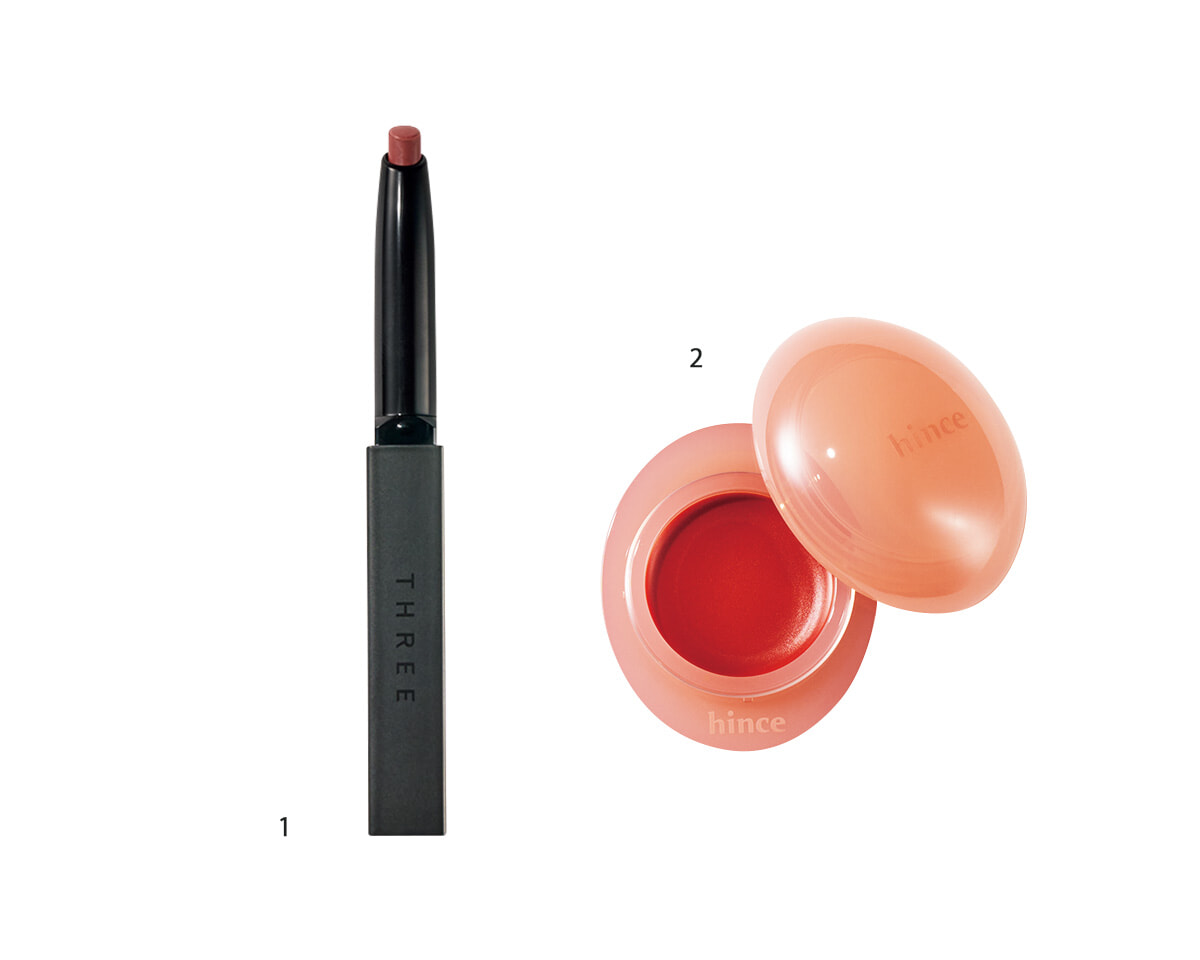 2. 雫から着想を得たバームテクスチャーのリップ&チーク。高粘度オイルによる透明コーティング膜が唇をシールド。彩度の高いキャロットカラー。