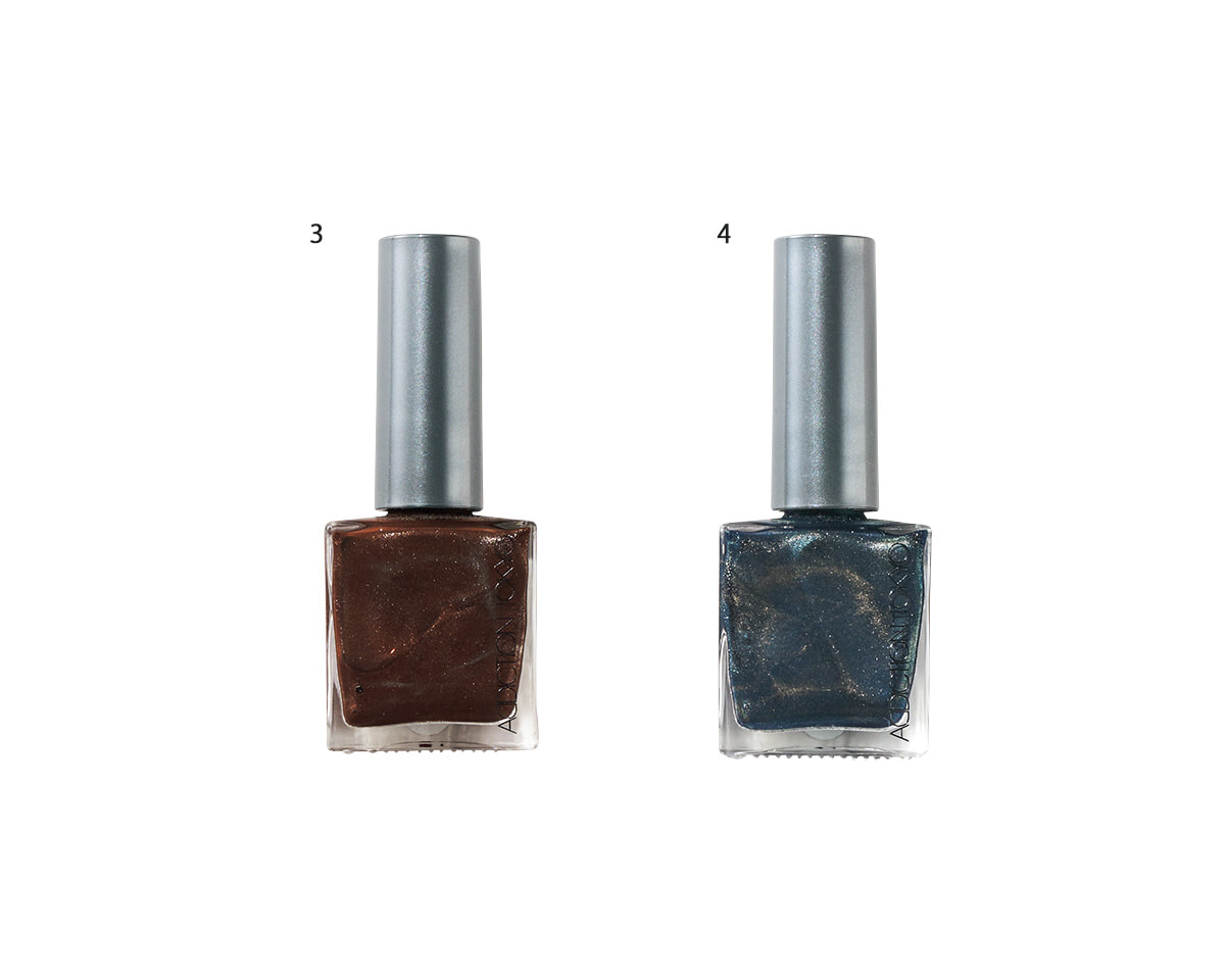 低温なネイビーに温かみのある赤みブラウンを合わせることで、両者の温度感が際立つ。それぞれを厚めに2度塗りし、マグネット スティック(別売り¥880)を近づけて光を拡散。ポリッシュでありながら、ジェルネイルのような仕上がりに。