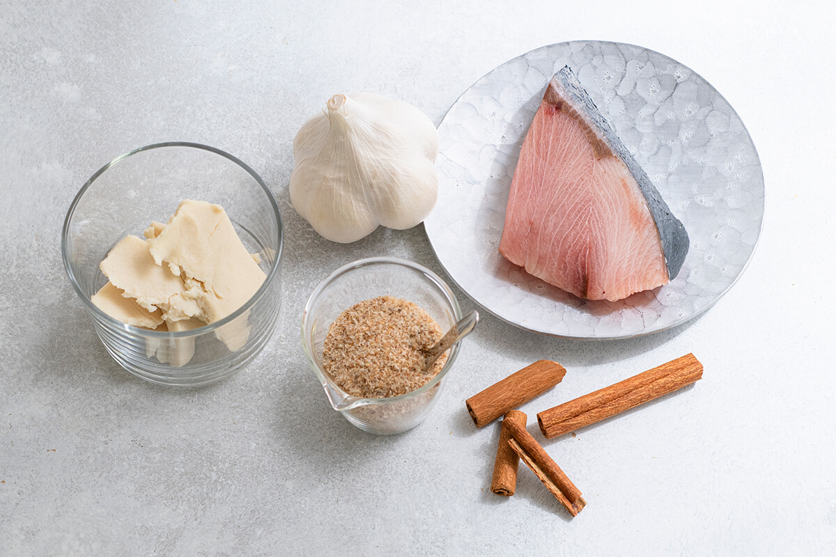 血液を若返らせる食べ物。右上から時計回りに青魚、シナモン、サイリウムハスク、酒粕、にんにく。サイリウムハスクは、米粉パンやお好み焼きなどの料理に使うと、もちっとした食感になります。シナモンパウダーを購入するときは、シナモン100%を選んで。