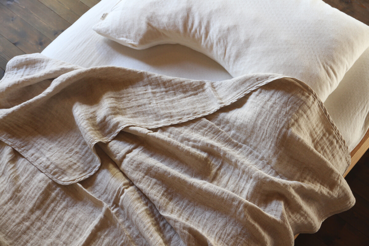 Michiruさんのおすすめ、リネンのガーゼケット。5枚分の糸を一気に立体的に織り上げる高度な織り方で仕上げられ、通気性と適度な保温性が保たれる。「寝室は冷房をつけず、サーキュレーターのみで寝ていますが、リネンのおかげで朝まで快適」リネン五重ガーゼケット シングル ¥16,500/金澤屋