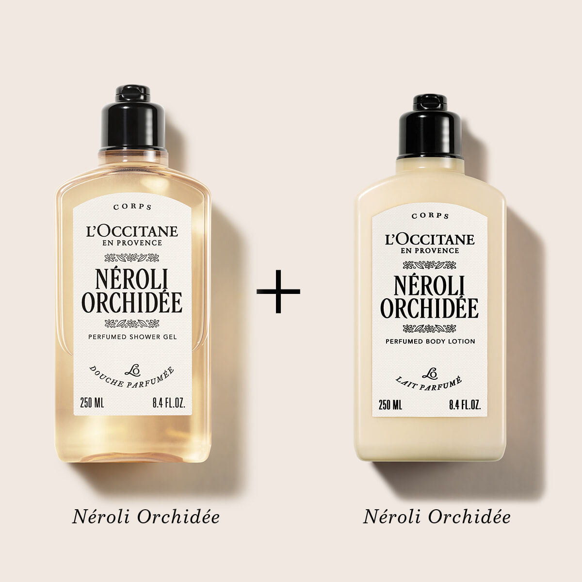 上から、ネロリオーキデ パフュームド シャワージェル 250ml ¥3,960、同 パフュームド ボディミルク 250ml ¥4,840(ともに10/1発売)/ともにロクシタンジャポン