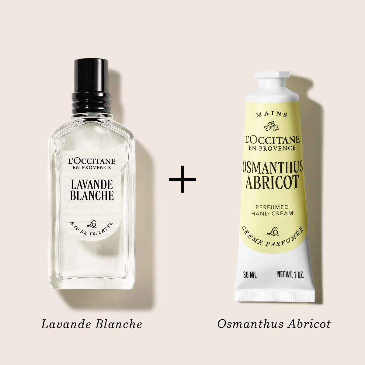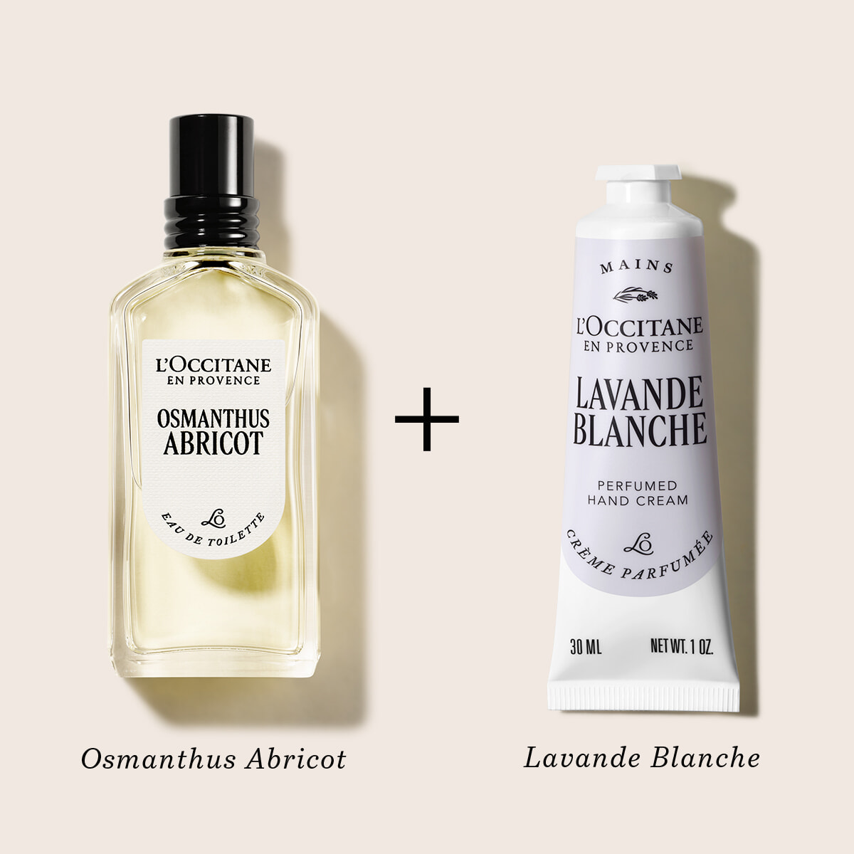 左から、ラヴァンドブランシュ オードトワレ 50ml ¥8,470、オスマンサスアブリコ パフュームド ハンドクリーム 30ml ¥1,870、オスマンサスアブリコ オードトワレ 50ml ¥8,470、ラヴァンドブランシュ パフュームド ハンドクリーム 30ml ¥1,870(すべて10/1発売)/以上ロクシタンジャポン