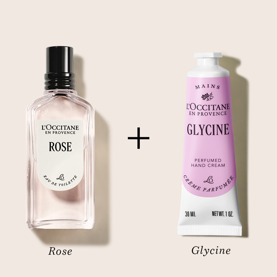 新たな出逢いを求めている時は、フェミニンな魅力を引き立ててくれる王道のローズのオードトワレを纏ってお出かけを。外出先では、さりげない藤やホワイトピオニーの花々が香るグリシーヌのハンドクリームでさりげなく品をリタッチ。好感度の高いフローラルのレイヤードで、指先から優しいムードを醸し出して。