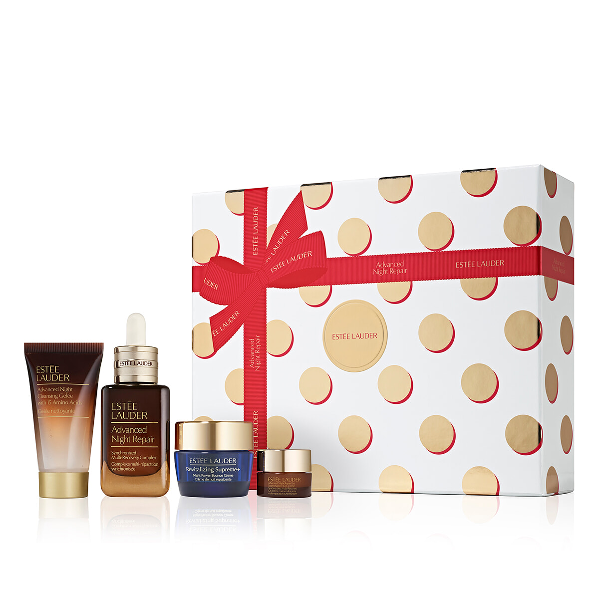 内容:アドバンス ナイトリペア SMR コンプレックス  50ml(現品)、アドバンス ナイトクレンジング ジュレ 30ml、アドバンス ナイトリペア アイ ジェルSMR コンプレックス 5ml、シュープリーム プラス ナイト バウンス クリーム 15ml
