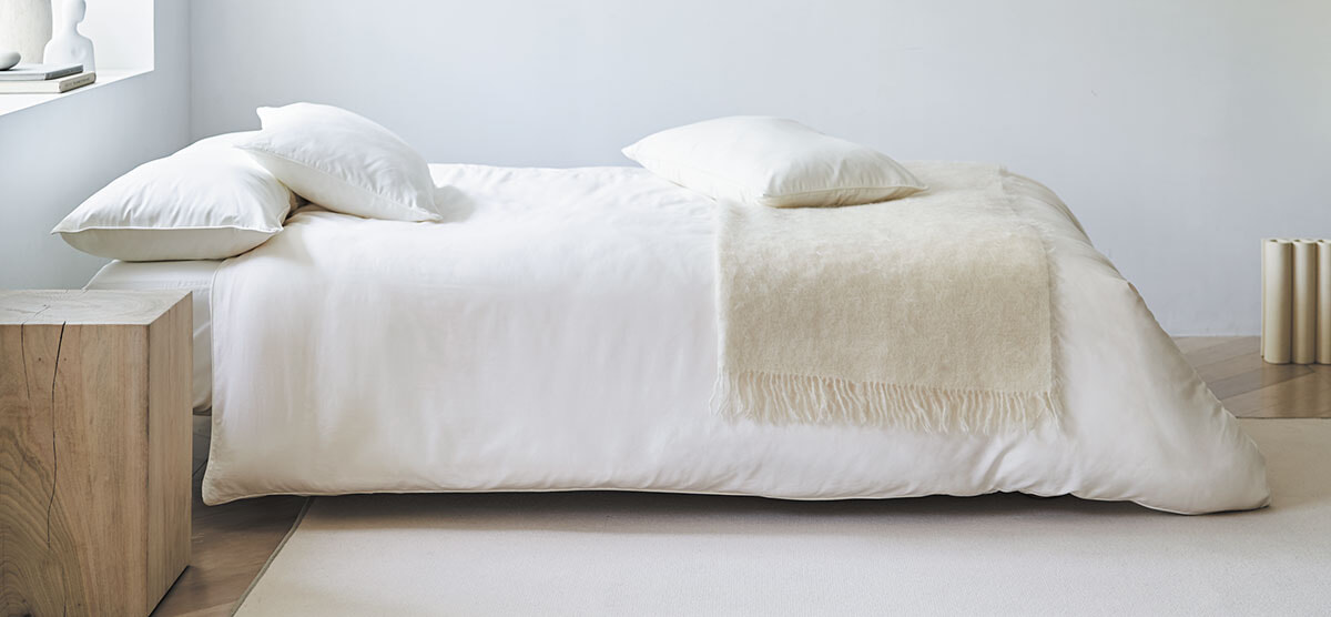 “睡眠浴”ができる寝具ブランド。「肌触りが良く寝心地抜群!」●YUAMI ボックスシーツ ¥15,000~、ピローケース¥4,800~/ともに帝人アクシア