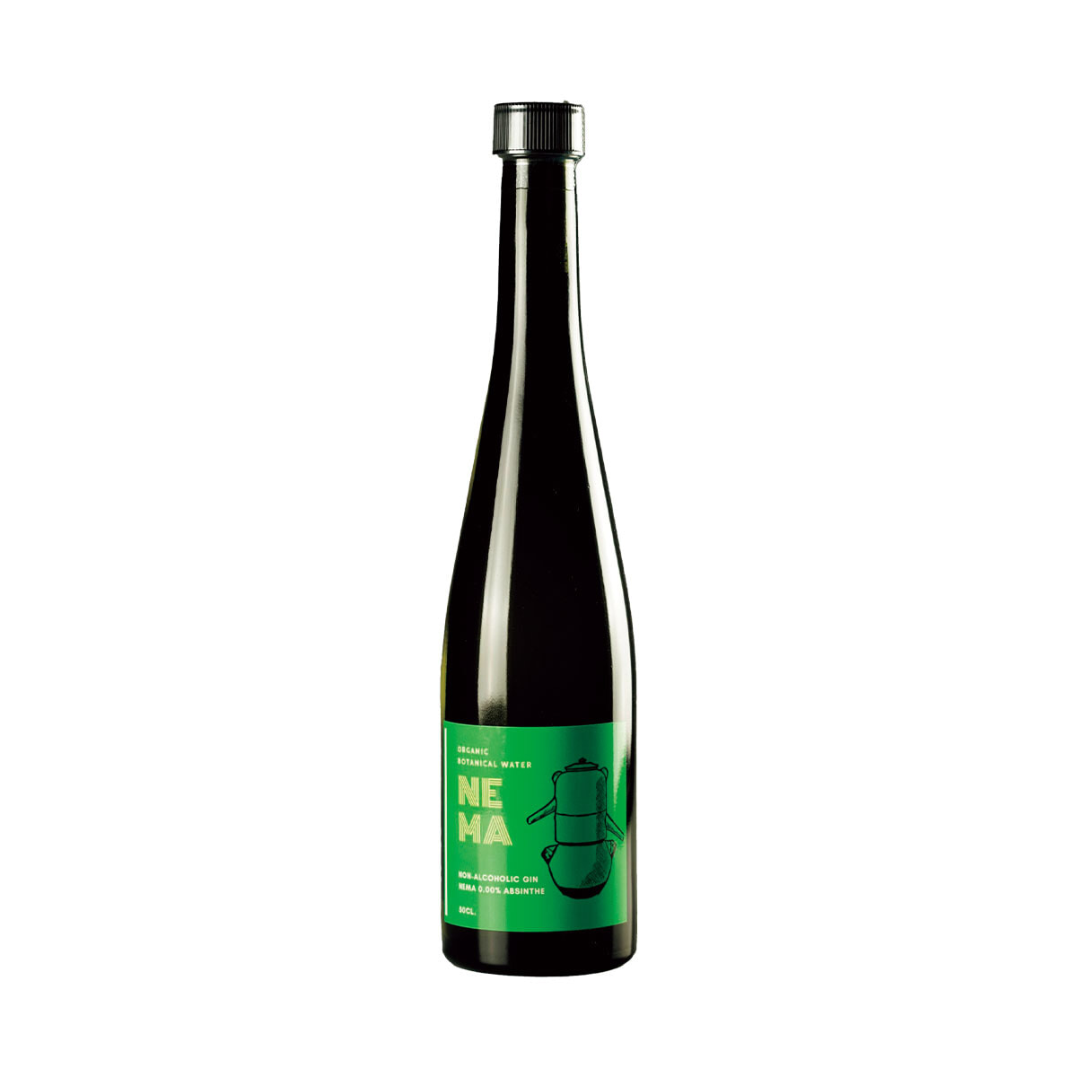 八ヶ岳山麓の湧水とバラを含む9種の植物で作られたアブサン風味のノンアルジン。「ハーブのブーケのような香りにも夢中」●ノンアルコールジン・ネマ 0.00% アブサン 500ml ¥3,400/カクテルバー ネマニャ
