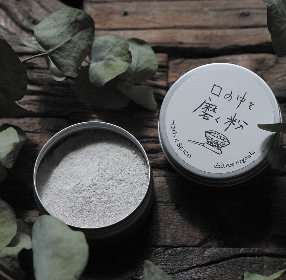 スパイスやハーブに、ミネラル豊富な硫黄岩塩をブレンドした歯磨き用パウダー。「ハーブがガツンと香るほかにはない独特なフレーバー」●口の中を磨く粉 15g ¥2,420/チーツリー オーガニック