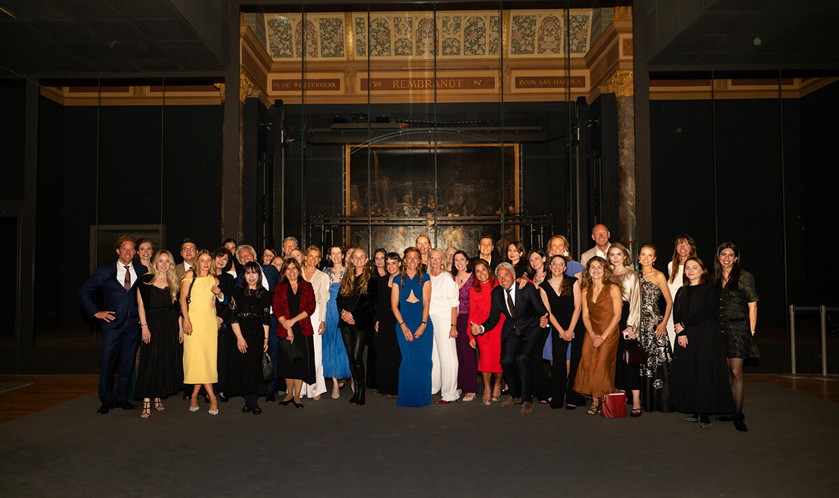 リチュアルズ25周年記念ディナーの参加者が勢揃い。アムステルダム国立美術館のオランダ絵画展示室内に、修復されながら展示されている、レンブラントの名画「夜警」の前で。photography: Milan Goldbach