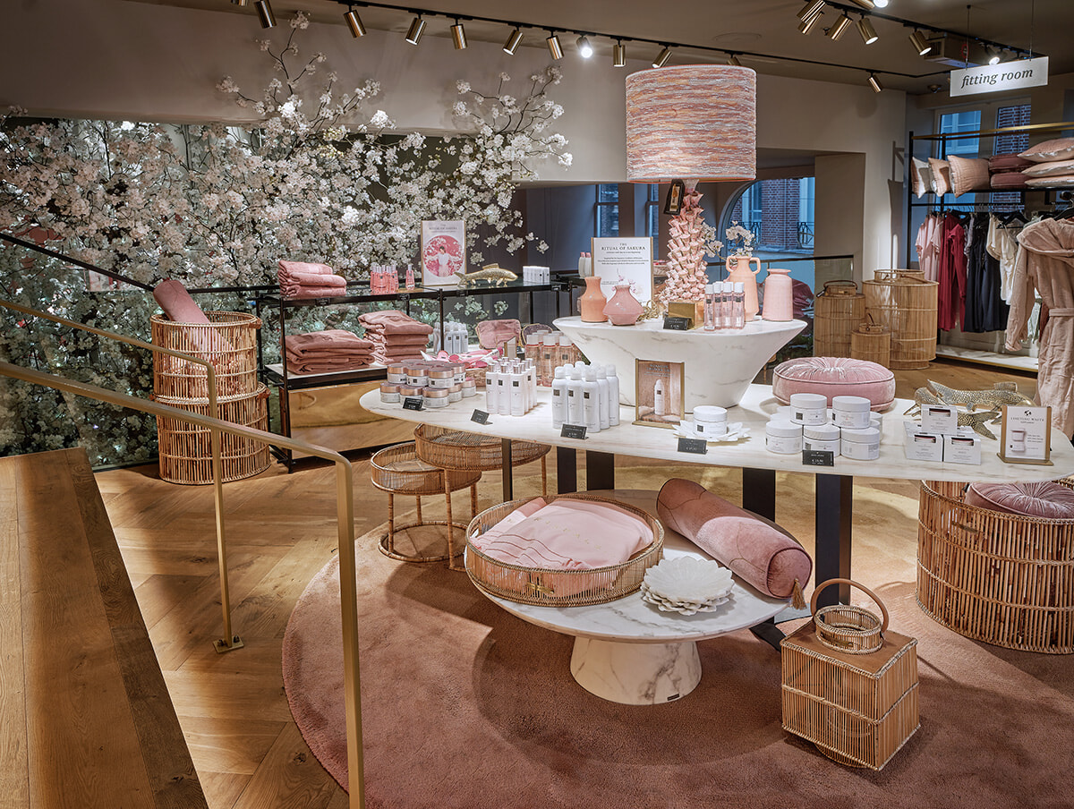 まずは、圧倒的な品揃えに心躍る。香りごとに製品がフルラインで揃い、たとえば人気の「リチュアル オブ サクラ」は桜の木をあしらったコーナーに並んでいる。カテゴリー別コーナーもあり、カーフレグランス、キャンドル、スキンケアなどはそれぞれまとまって全種類並んでいるから、探しているものや好きな香りが必ず見つかる。ボディ・バスケアはもちろん、ホームリネンやインテリア、ラウンジウエア、コスメ、ジュエリーまでが揃い、気づけば買い物かごはいっぱい。