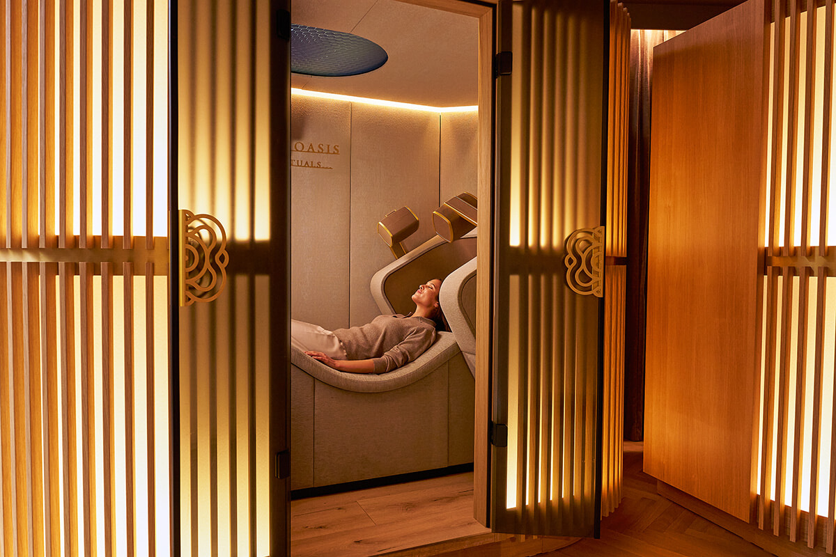 「ブレインマッサージ」のブース。頭上のスクリーンやスピーカー、包み込むようなソファーで、五感に直接届く究極のリラックスプログラム。30分と55分のコースがある。