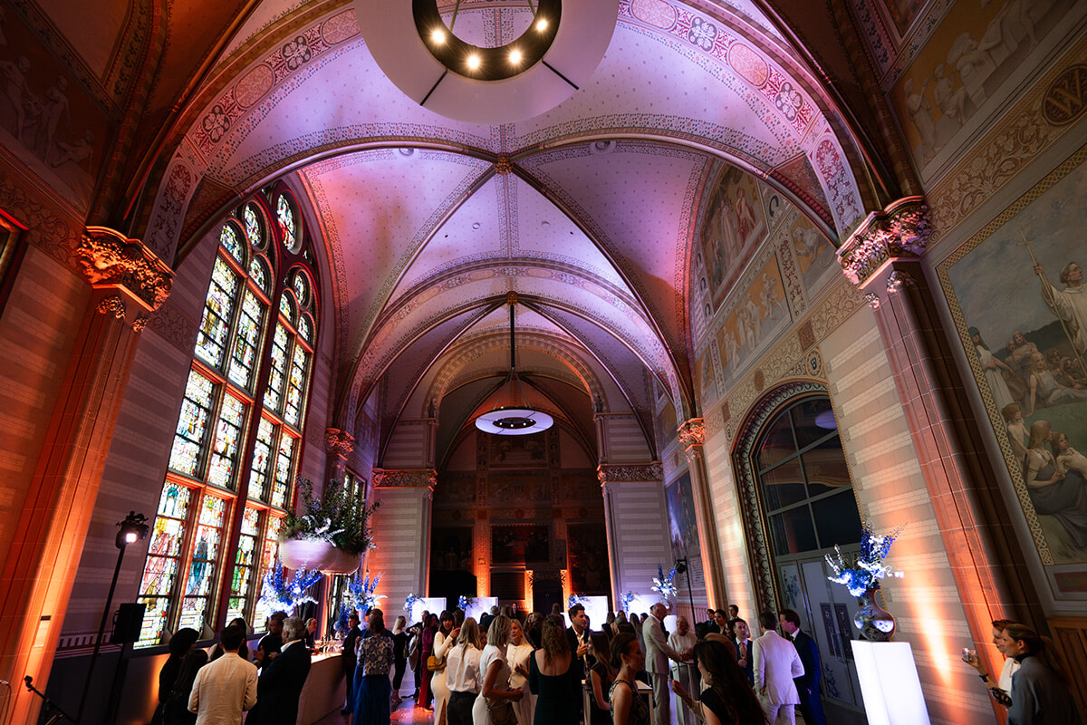 アムステルダム国立美術館での25周年記念ディナーの前のカクテル。会場は、ステンドグラスや壁画がゴージャスな、美術館内の広間だ。photography: Milan Goldbach