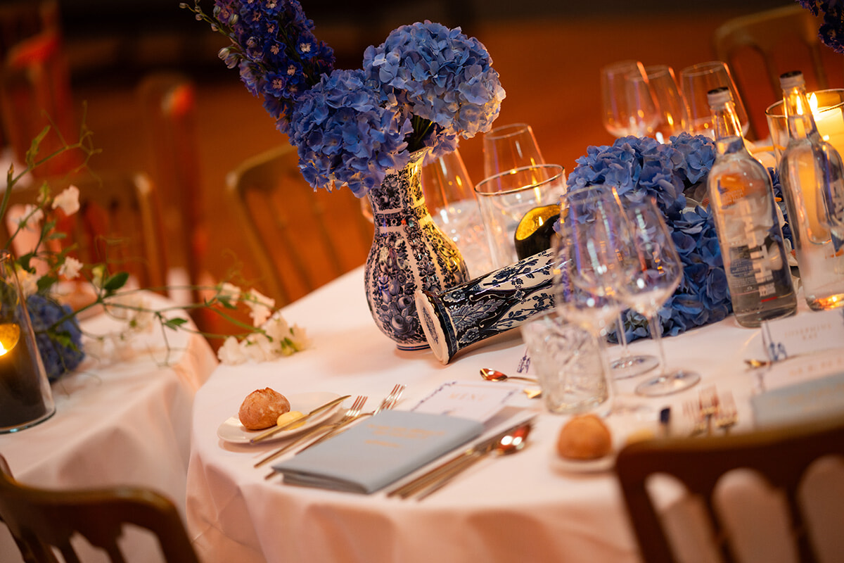 25周年ディナーのテーマは、「アムステルダム コレクション」。テーブルも、白地に青で花鳥が描かれたデルフト焼のイメージでセッティングされていた。photography: Milan Goldbach