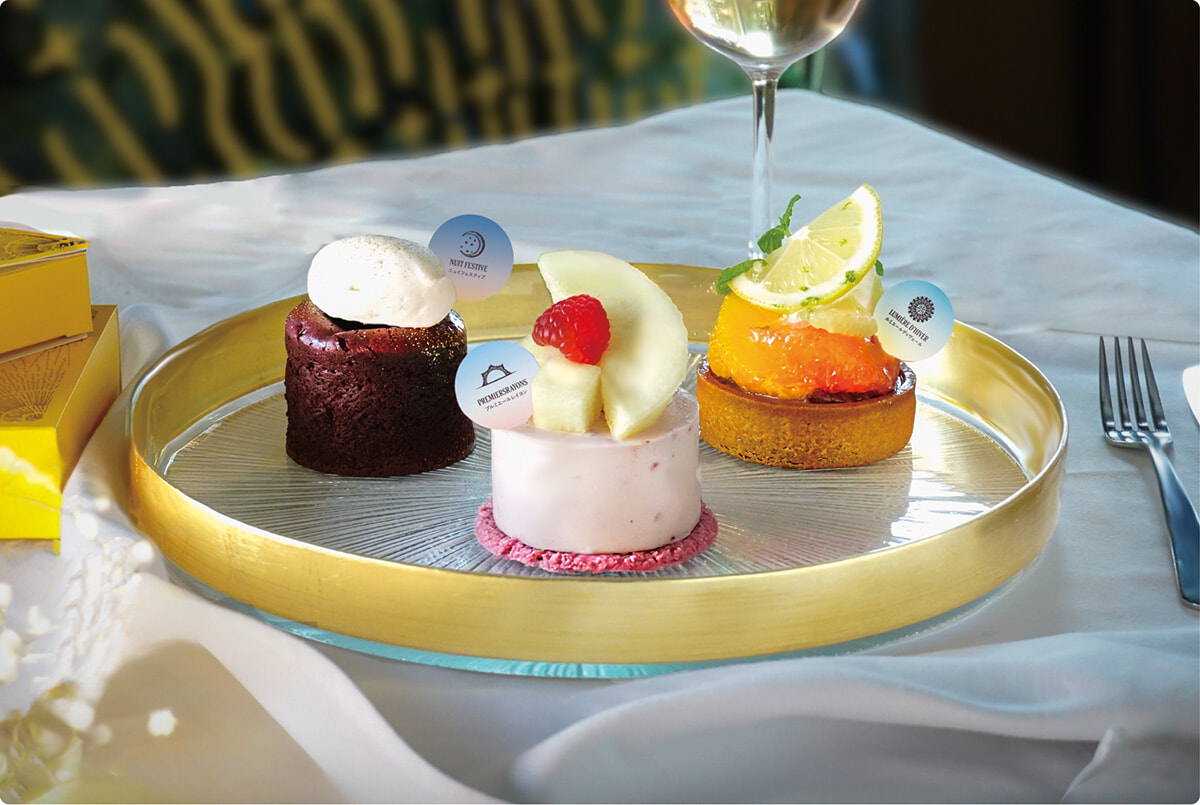 1月6日までの期間限定メニュー。朝の光「プルミエール レイヨン」の「洋梨とピオニーのレアチーズケーキ」、昼の光「ルミエール ディヴェール」の「アールグレイ香る柑橘のタルト」、そして夜の光「ニュイ フェスティブ」の「カシスの温製ガトーショコラ バニラクリーム添え」。個性際立つ3種の味わいを堪能して。「ホリデー スペシャル デザート アソートメント」¥2,280