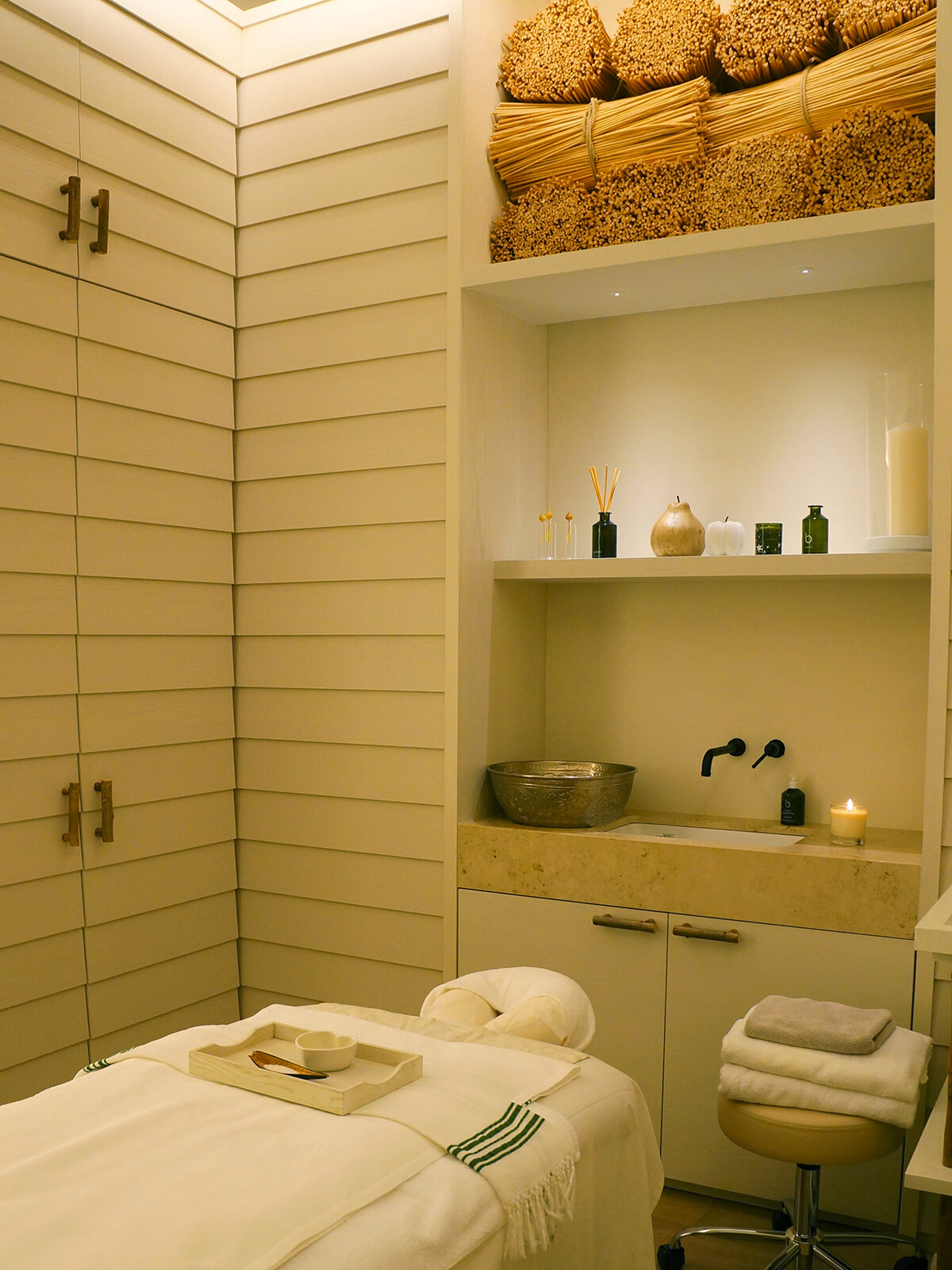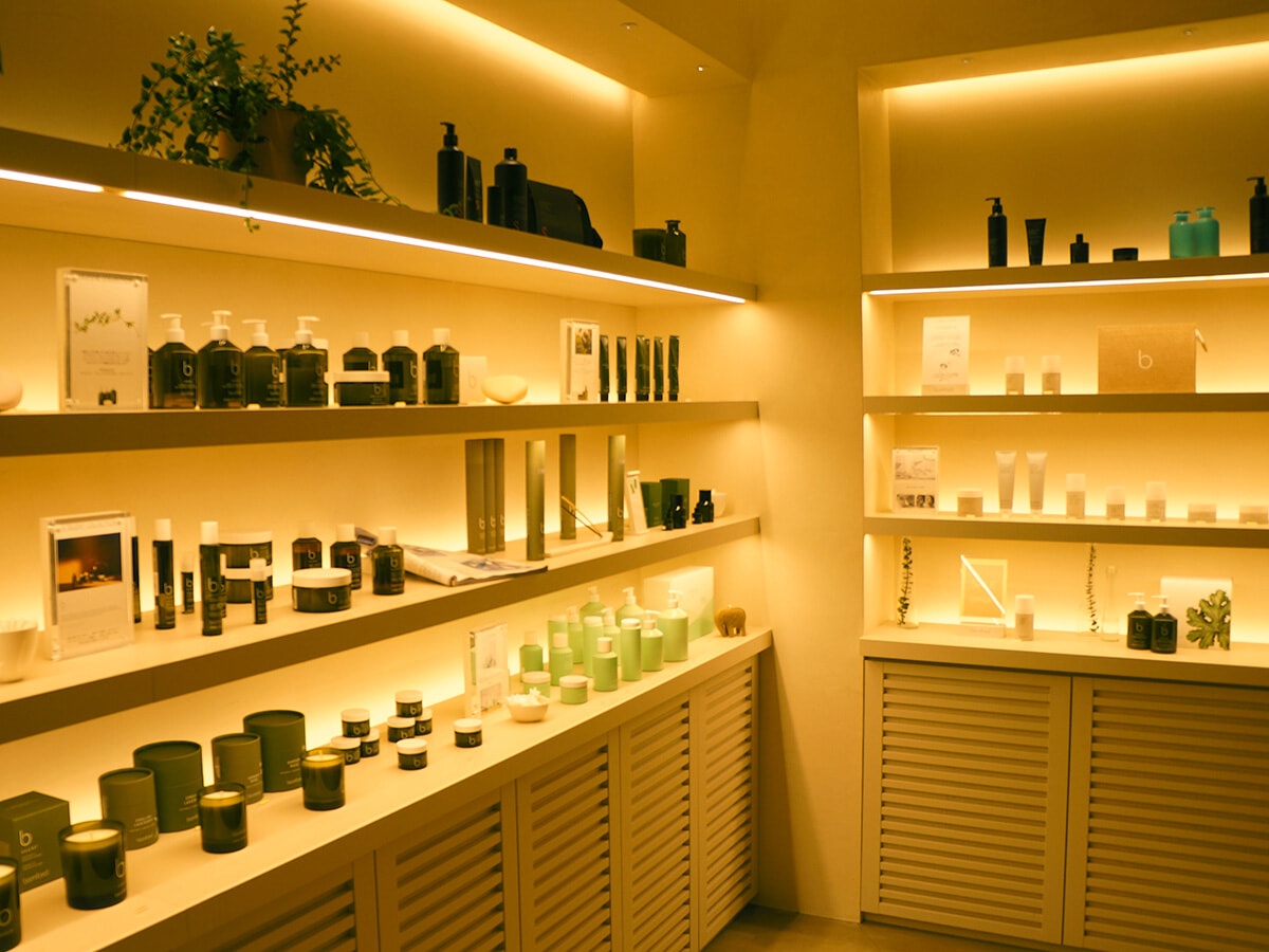 柔らかいベージュトーンを基調とした雰囲気は以前のまま、グリーンがさらにふんだんに配され、落ち着きと心地よさで満たされた空間に。店舗の奥に控えるスパのトリートメントルームも移転前の雰囲気を踏襲し、農場の納屋を思わせるデザインに仕上げられている。少し照明が落とされた隠れ家のような雰囲気の漂う扉をくぐると、英国のカントリースタイルにモダンで気品あふれるエッセンスを加えた、バンフォードならではの世界観が。