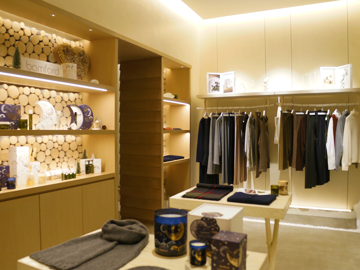 身支度を整えて外に出ると、ショップにはスパで使用してもらったアイテムをはじめピローミストやキャンドル、フレグランスにお香といった幅広い製品がずらりと並んでおり、またも幸せな気分に。トリートメントの中で特に気に入ったものの中から自分へのお土産を吟味するのもいいし、格調高く良質な品々はギフトにも重宝すること間違いなし。広い店内には、レディ・キャロル・バンフォードが手がけたファッションアイテムのセクションも。シンプルながらもこだわり抜かれたクオリティの高さを感じ、英国貴族の暮らしに思いを馳せるのも楽しい。