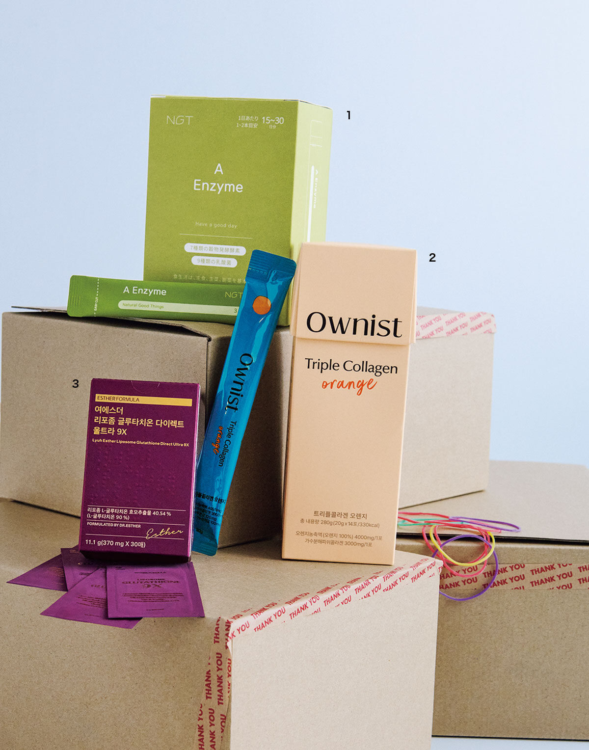 1. NGT 2025年に日本上陸した韓国初グルテンフリー酵素。7種の穀物と9種の乳酸菌配合で消化をサポート。きな粉味で苦味がなく飲みやすい。エーエンザイム 3g ×30本 ¥6,264/韓国高麗人蔘社 2. Ownist コラーゲン、エラスチン、ヒアルロン酸をオーガニックオレンジジュースに凝縮。合成香料、着色料フリー設計で続けやすい。トリプルコラーゲン オレンジ 20g×14本 ¥4,800/オニスト 3. ESTHER FORMULA 予防医学のヨ・エスター博士が開発。個包装の薄いフィルムを口内の上顎の粘膜に付着させて溶かす画期的な形状。”白玉注射”で知られるグルタチオンを素早く摂取。二日酔い防止にも。ヨエスターリポソームグルタチオンダイレクトウルトラ9X 30枚 ¥9,800/エスターフォーミュラ