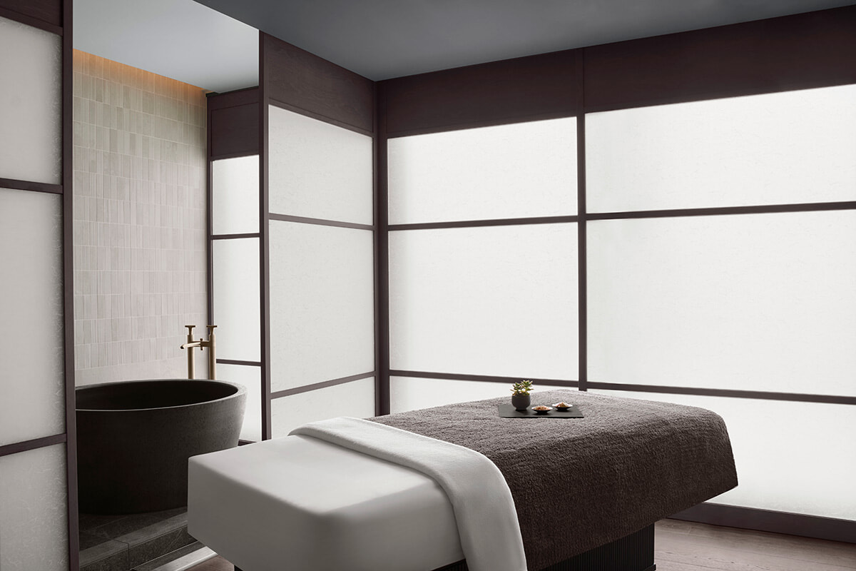 そのコンセプトを最も体現した「マインドフルルーム」を予約すると、ホテルの中でもプールやスパが位置する28階でのステイが確約される。チェックインの際もホテルロビーへ向かう必要はなく、直接スパラウンジで。人々が行き交う賑やかなロビーももちろん素敵だけれど、日頃の喧騒を忘れたいステイケーションには、この静けさがありがたい。