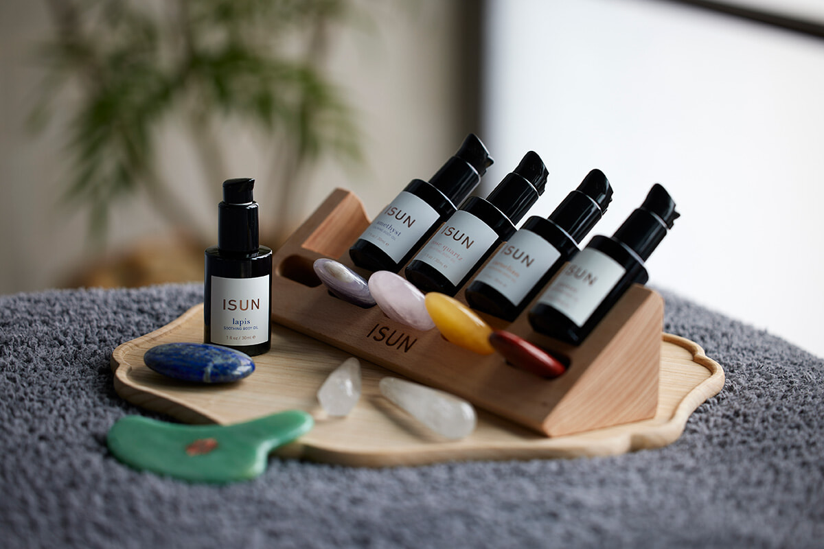 コロラド州の山岳地帯で手つかずの自然の恵みやハーブを用い、コールドプロセス製法で天然石を浸しつくられるアイサンのボディオイルは、どれも多層的で示唆に富んだ、馥郁たる香りのものが揃う。好きな香調から選ぶのはもちろんだし、ローズクォーツやカーネリアン、ガーネットといったジェムストーンに紐づけられるキーワードや、各ストーンと結びつきが強いとされるチャクラの部位から選んでみるのも興味深い。
