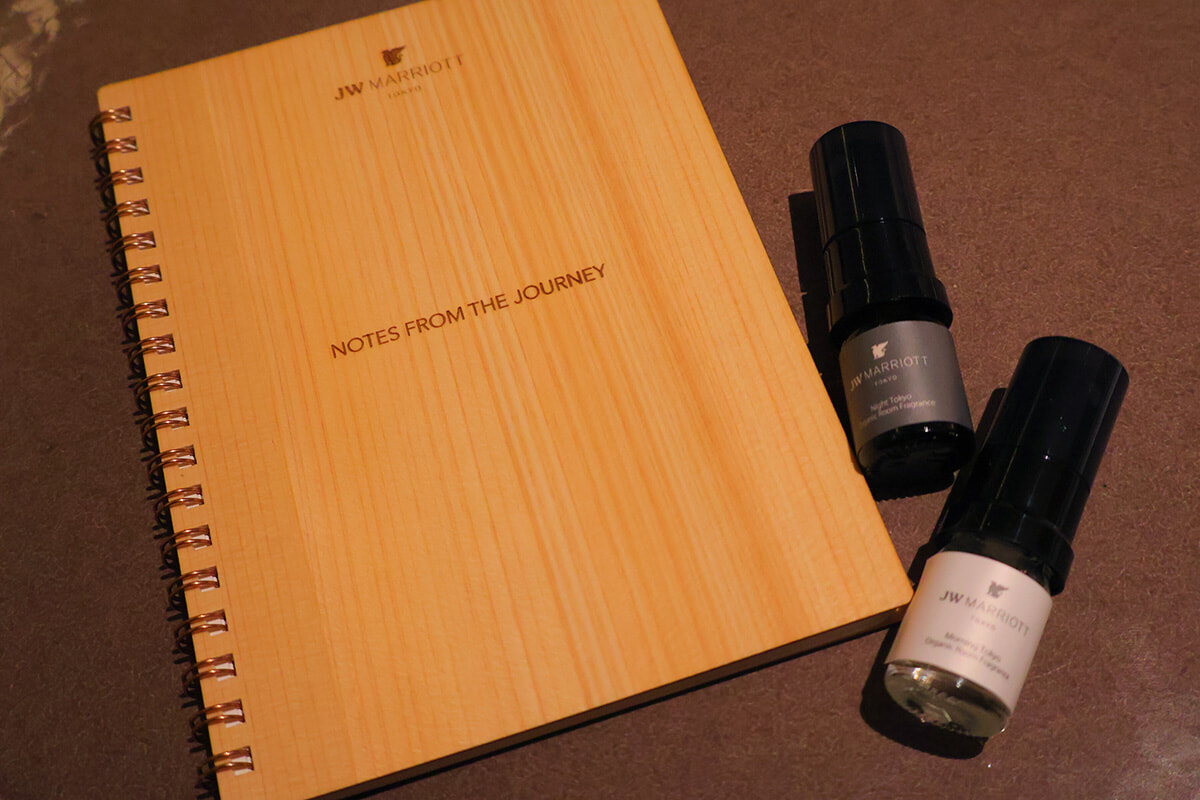 食事を終えて部屋に戻ると、またうれしいサプライズが。就寝の準備を整えるターンダウンサービスの際に、ホテルオリジナルのノートや、それぞれ眠りと目覚めに適したルームフレグランスなどのギフトが迎えてくれたのだ。