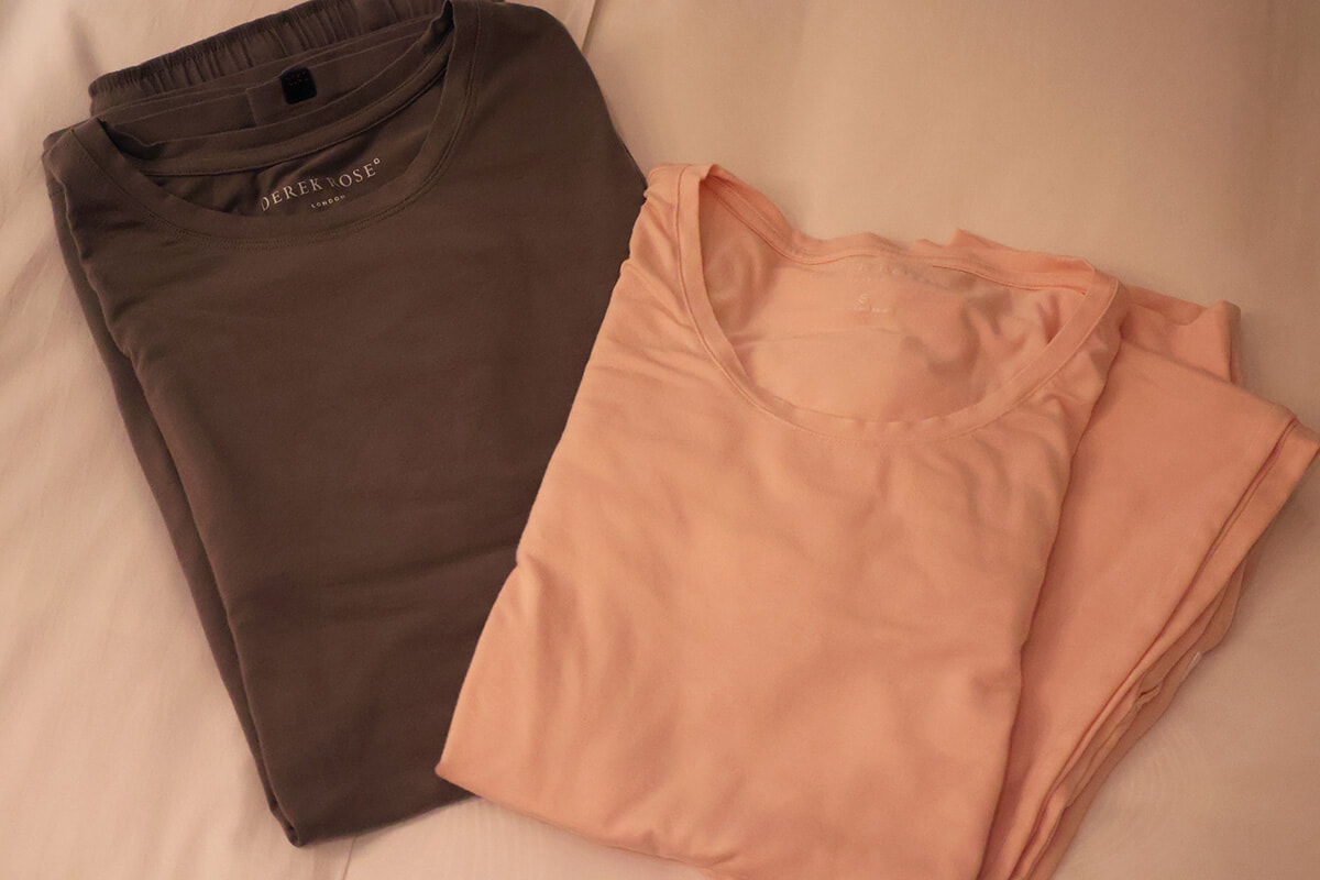 就寝時は、このルームタイプとスイートルームにのみ備えられた、イギリス発のデレク ローズのパジャマに身を包んで。高品質な就寝着やラウンジウエアで100年もの歴史を誇る老舗のパジャマは、とろけるような肌心地。希望すれば、新品を購入してお土産に持ち帰ることも可能だそう。